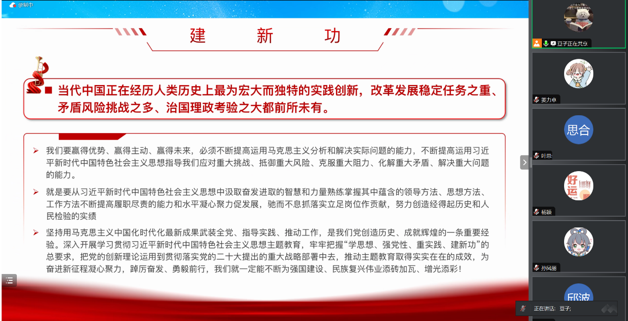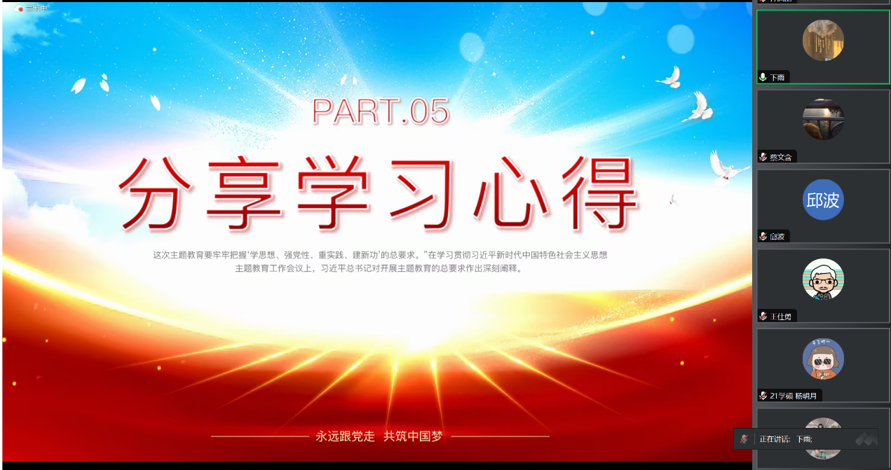 会议伊始,支部书记尹伊美以“牢牢把握主题教育的总要求”微视频切入,全面系统分析“学思想、强党性、重实践、建新功”丰富内涵以及对推动主题教育扎实开展,努力取得实实在在成效的重要意义。她强调,我们要自觉践行新时代中国特色社会主义思想,用以改造客观世界、推动事业发展,用以观察时代、把握时代、引领时代,积极识变应变求变,推动中国式现代化取得新进展新突破。