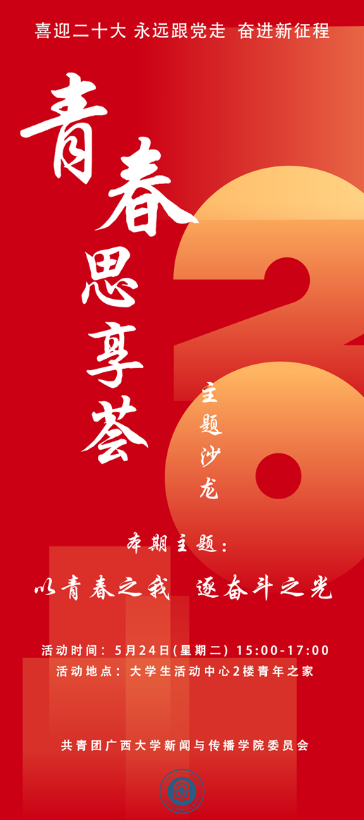 为展现新时代中国青年有理想、有本领、有担当的青春面貌和不懈奋斗的昂扬姿态,喜迎党的二十大胜利到来,365英国上市集团将于5月24日(周二)15:00在老员工活动中心二楼青年之家举行“以青春之我,逐奋斗之光”青春思享荟主题沙龙(第二期)。从青年的视角,讲述青春故事,传递精神力量,从而更好鼓舞青年朋友在新时代勇毅前行。