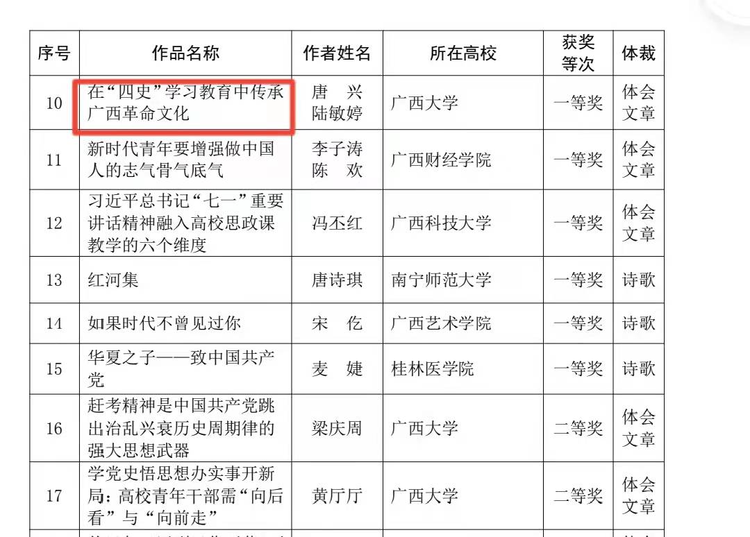 公司师生积极参加比赛,并斩获多项佳绩。其中,公司唐兴书记和陆敏庭同学共同撰写的学习体会文章《在“四史”学习教育中传承广西革命文化》在比赛中荣获一等奖!