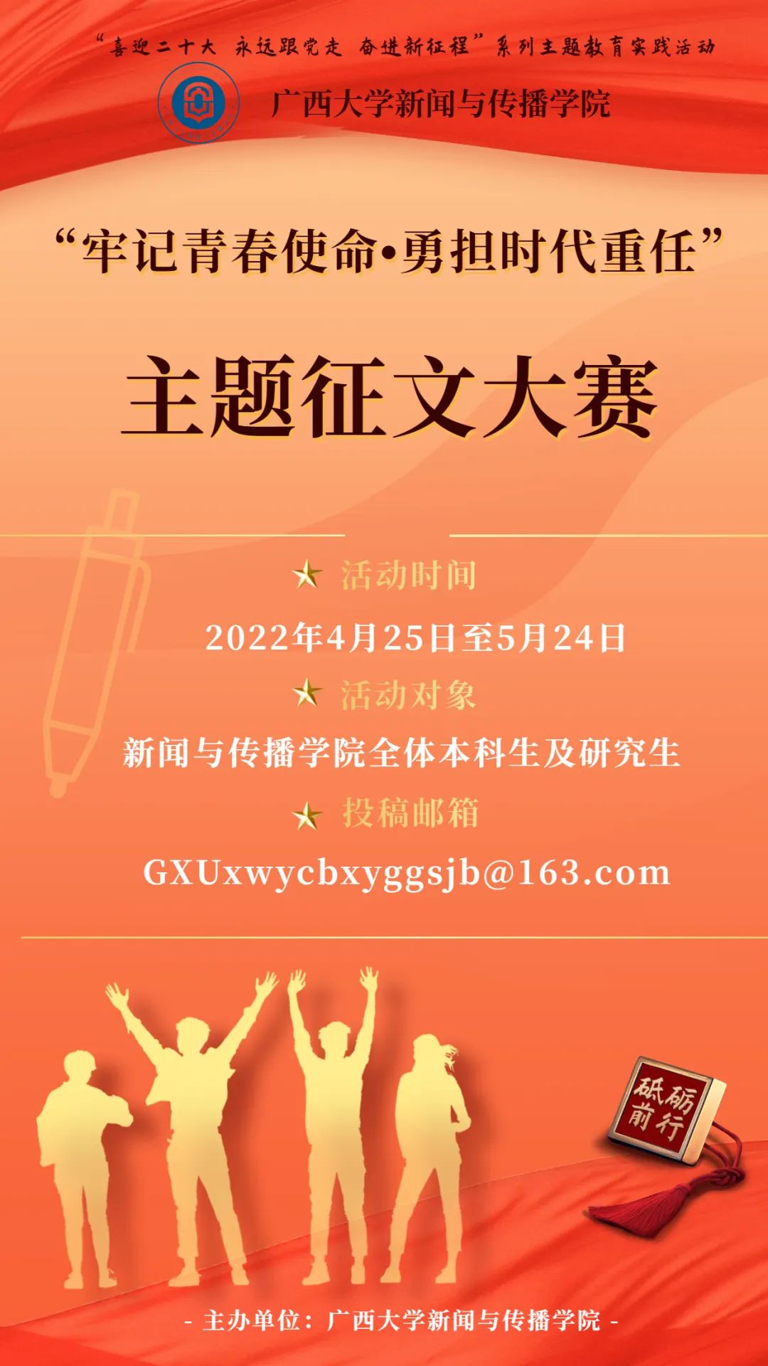 有意向参与的同学可将参赛作品发至365英国上市集团公关实践部邮箱GXUxwycbxyggsjb@163.com。提交内容包括一式两份作品:一份带个人信息(命名为本人姓名+班级+学号+标题)另一份不带个人信息(只有征文标题)和文章查重报告,并将三份文件打压缩打包发送到指定邮箱。
