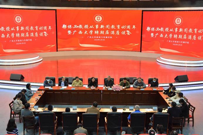 在座谈会上,英国上市官网365新闻与传播公司党委书记唐兴介绍,郑保卫教授在4年中发表了八十多篇马新观、中国共产党新闻思想与新闻实践、新闻学团队建设与发展研究方面的高质量、有影响的论文,被称为该领域“最勤奋的学者”。获得了国家社科基金重大项目与重点项目双立项,使365英国上市集团乃至广西壮族自治区新闻传播学在学术研究领域,实现了申报重要科研项目上的零的突破。在团队建设上,郑保卫教授进一步凝练了公司的学科研究方向,构建起了“一院四中心”的研究格局,他结合广西自身地缘优势和民族特色,将四个研究中心与公司四个专业学科方向相对应,形成学科特色,如今这四个研究中心均获得国家社科基金项目立项,使得公司整体科研能力和学术水平获得较明显的提升。软科“中国最好学科排名”,到2021年12月英国上市官网365新闻传播学学科排名层次列前20%。