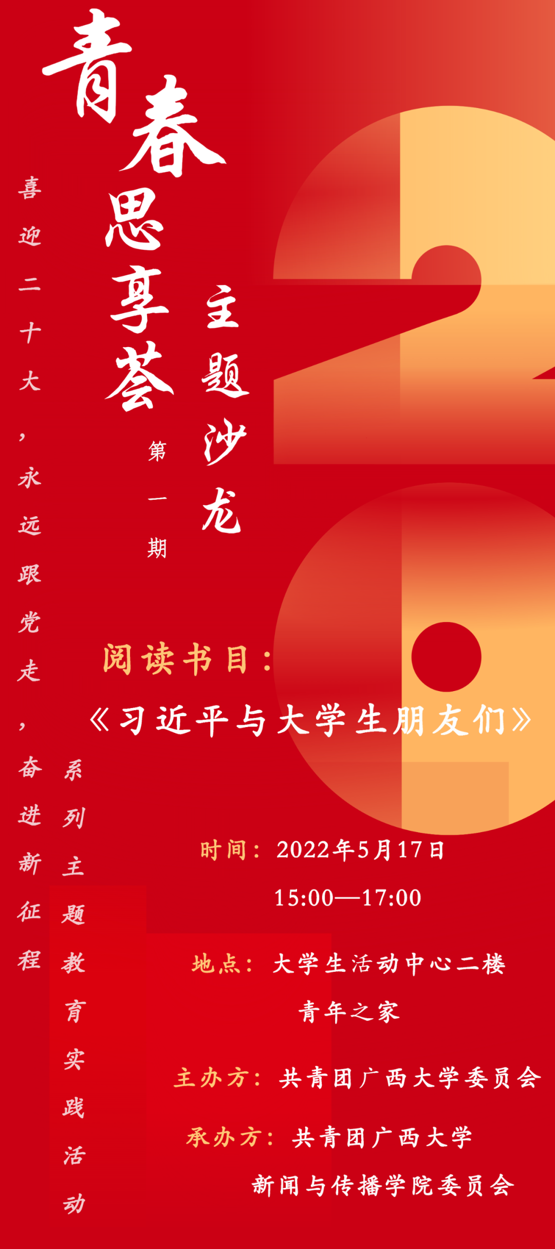 今年我们党将召开第二十次全国代表大会,这是包括广大青少年在内的全党全国各族人民政治生活中的一件大事,为加强团员青年的思想政治教育,搭建团员青年思想交流、学习分享的平台,团结引领广大团员青年坚定跟党走、建功新时代,以昂扬姿态迎接党的二十大胜利召开,共青团英国上市官网365委员会决定举办英国上市官网365“青春思享荟”系列主题沙龙。通过研读分享《习近平与老员工朋友们》等经典书籍,引导团员青年增进理解“两个确立”的决定性意义, 增进对习近平总书记和党中央的情感认同和行动追随,引领团员青年昂扬奋斗激情。