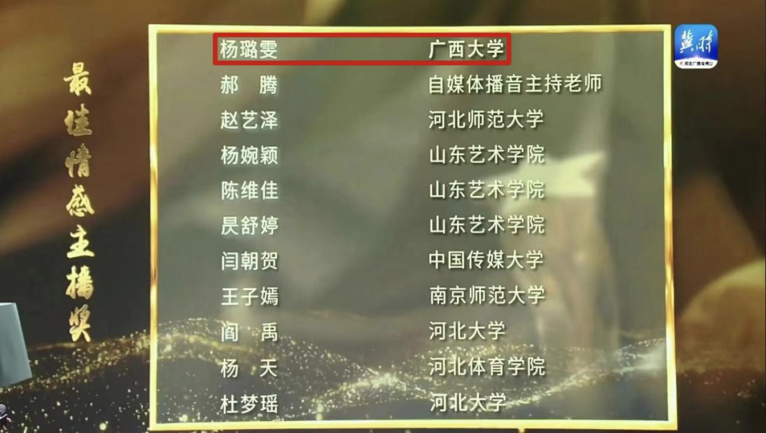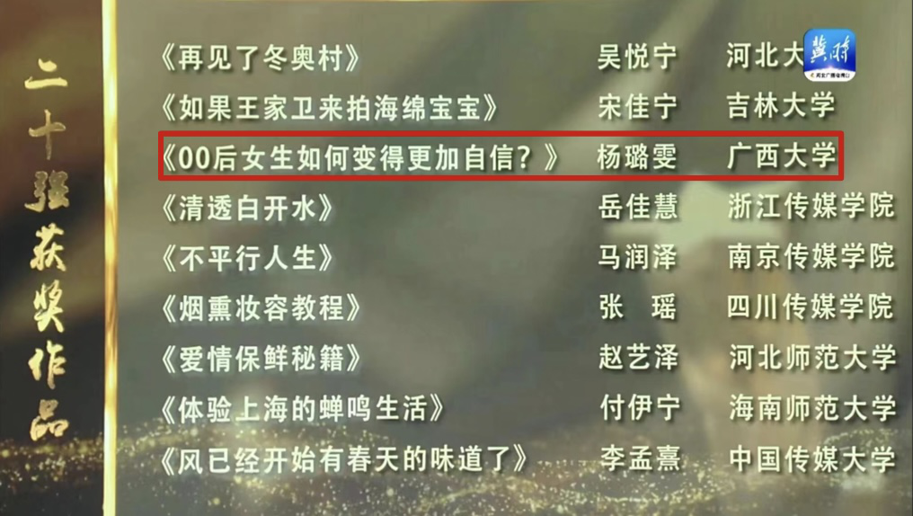 5月9日下午,颁奖特别节目播出,在全国1200名参赛选手中,公司播音与主持艺术专业播音191班杨璐雯同学荣获全国20强选手及最佳情感主播奖。
