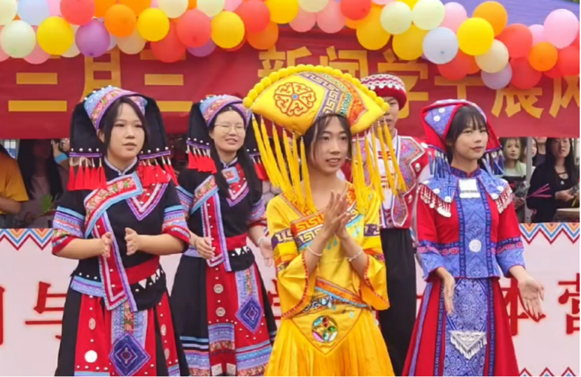 身着绚丽民族服饰的同学们,款步走秀,犹如一道道流动的风景线。壮锦色彩斑斓,服饰精美的绣花彰显着匠人的巧思。模特们步伐优雅,身姿挺拔,仿佛穿越时空,将古老的民族风情展现得淋漓尽致。