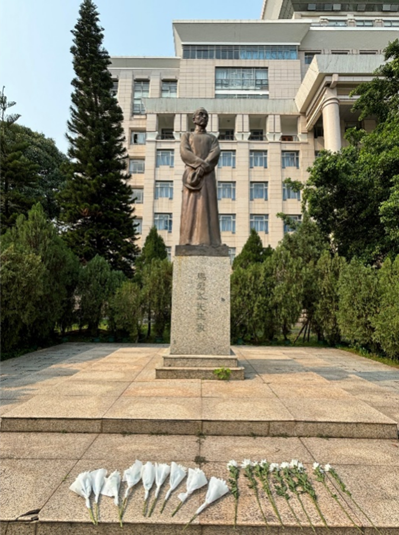 天朗气清,惠风和畅,英国上市官网365首任董事长马君武的雕像更显宏伟沉静。在教工第一党支部书记张明老师的带领下,两个支部的党员依次上前,怀着崇敬之情,在马君武董事长雕像前献上白菊花,深深鞠躬,表达对先贤的缅怀和追思。