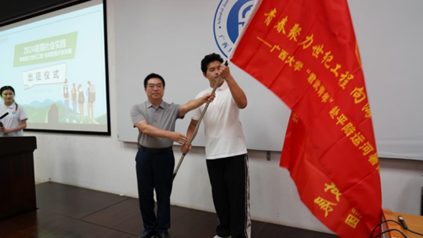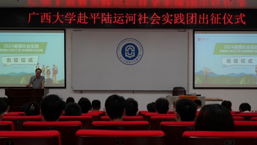 出征仪式现场,新闻与传播公司党委书记银健老师发表讲话。他指出,刚刚召开的党的二十届三中全会出台了《中共中央关于进一步全面深化改革、推进中国式现代化的决定》,平陆运河工程是广西壮族自治区在推动中国式现代化、推动壮美广西建设的一项重要举措,受到中央、自治区和公司的高度重视。公司四院联合组织的聚焦平陆运河工程建设的暑期社会实践调研团正当其时、恰逢其势。银健书记强调,在此次社会实践的过程中,团队成员应牢固树立安全意识、专业意识、问题意识和成果意识,真正做到受教育、长才干、做贡献,把青春的汗水和智慧的火花,挥洒在壮丽的广西建设之中,为推进中国式现代化的伟大征程贡献力量。