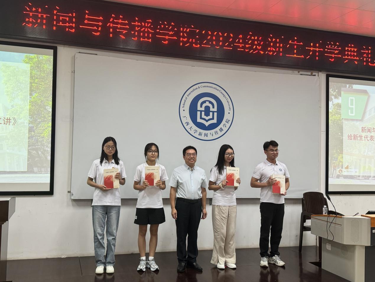 公司党委书记银健向新生代表赠送《马克思主义新闻观十二讲》,鼓励同学们学习传承马克思主义新闻观,将其作为治学的指引。