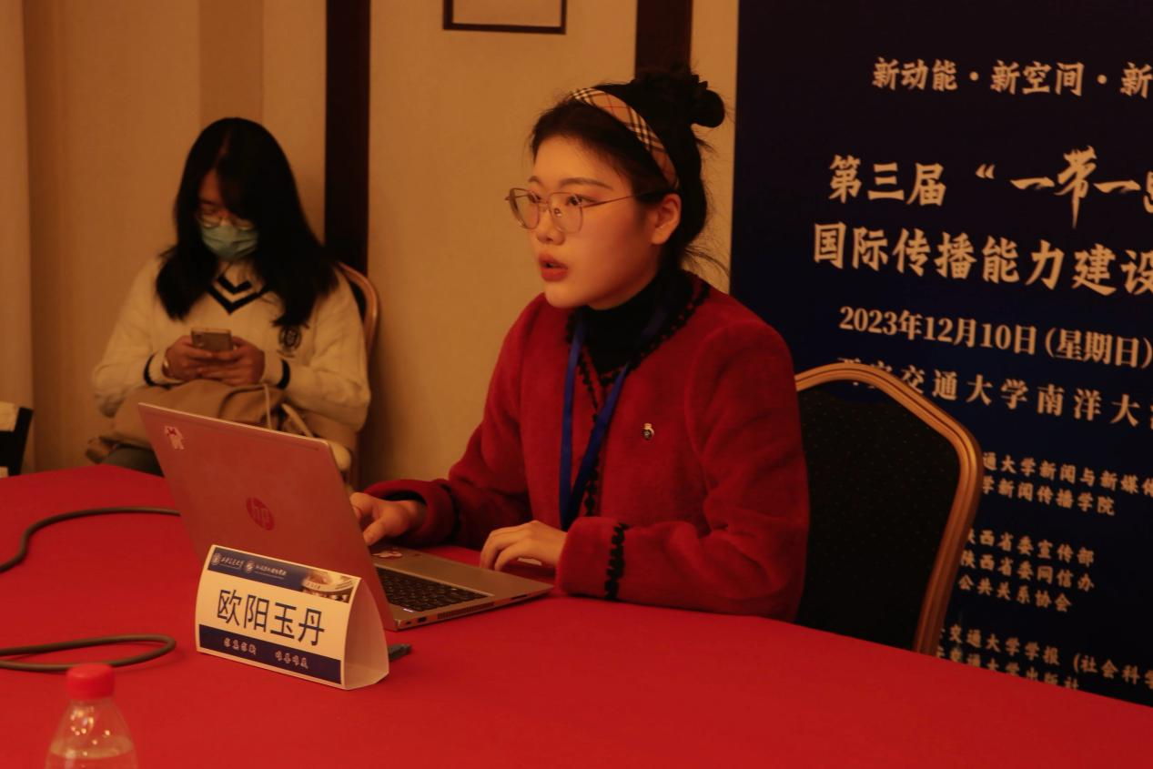欧阳玉丹同学在“‘一带一路’国际传播研究前沿问题”的分论坛中汇报了她和薛强副教授合作完成的论文《网络空间命运共同体视角下中国互联网产品出海东盟研究》。文章从中国-东盟网络空间命运共同体建设的重要意义、东盟国家互联网发展概况与使用特征、中国互联网企业出海到东盟的策略与建议等三个部分展开。