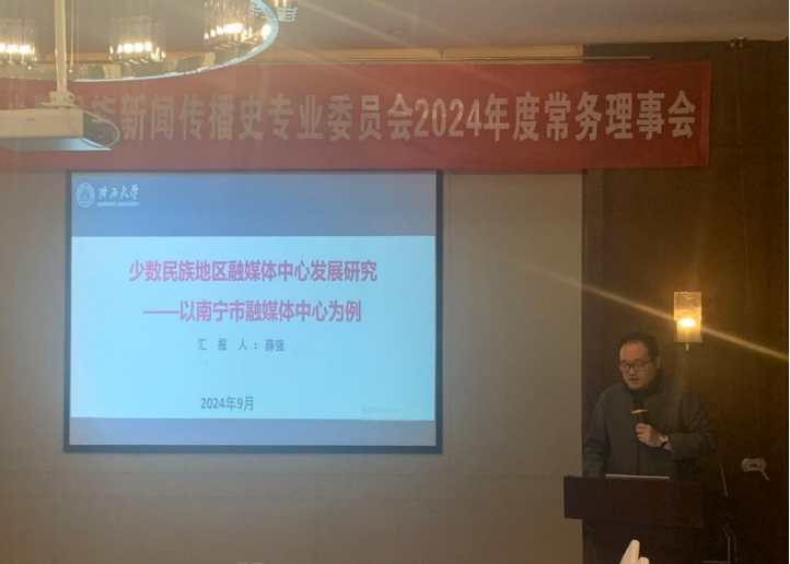 薛强副教授在分论坛五“传统媒体转型发展研究专题”分享了和指导的2023级硕士生陈岚合作完成的论文《民族地区融媒体中心发展研究—以南宁市融媒体中心为例》。今年5月11日,南宁市融媒体中心整合了南宁日报社、南宁广播电视台等市级传媒资源挂牌成立。论文分析了南宁市融媒体中心成立以来的发展现状,取得的成果与存在问题,并提出了相应的发展建议。研究认为,南宁市融媒体中心要在促进民族融合、增强民族凝聚力、加大国际传播力度等方面发挥更重要的作用。
