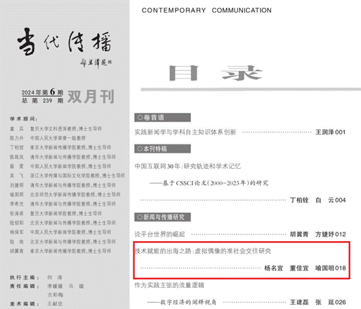 公司杨名宜副教授团队在CSSCI期刊《当代传播》2024年6期上发表了题为《技术赋能的出海之路:虚拟偶像的准社会交往研究》的论文。该研究得到教育部长江学者特聘教授、北京师范大学传播创新与未来实验平台主任喻国明教授的指导。论文第二作者为公司2023级新闻传播学硕士生董佳宜。
