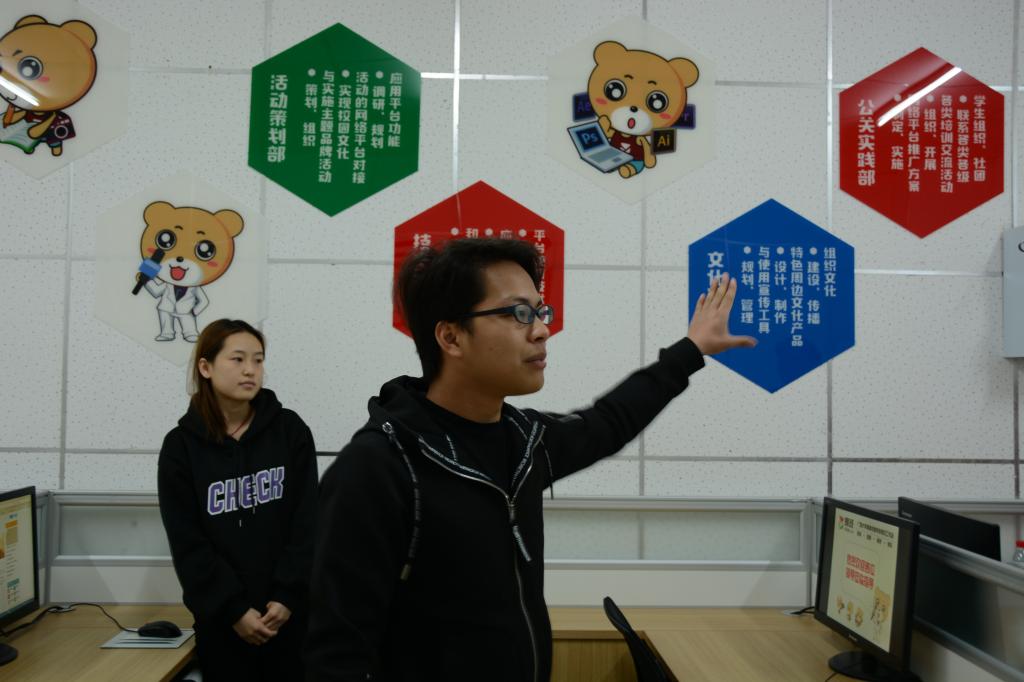 365英国上市集团易班工作站站长覃玉富同学向来访嘉宾介绍了部门职能、文化建设、活动案例等方面,并展示了具有学科特色的周边文化产品,获得了李迎春副经理一行的充分肯定。
