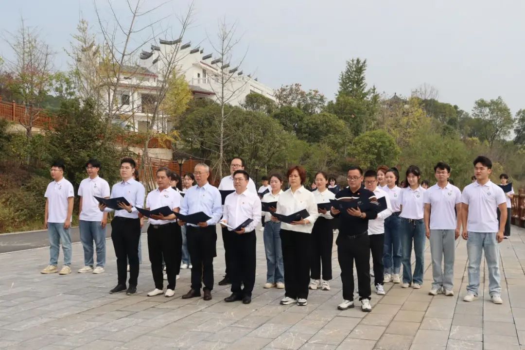 在纪念园广场,师生们为“红军魂”雕塑敬献花篮,并向红军烈士三鞠躬、悼念默哀。随后,全体现场朗诵《湘江之歌》,声音铿锵有力,饱含对革命历史的深情回望,是对英雄先烈的崇高敬意,是对未来征程的坚定信念。
