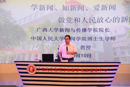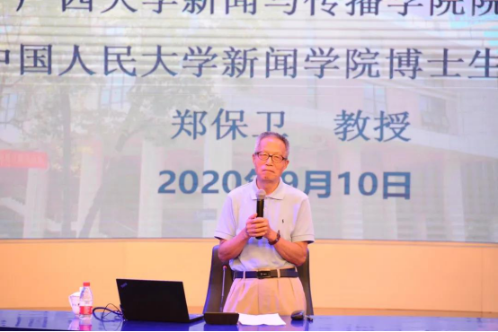 讲座伊始,郑保卫经理首先表达了对老师们节日的祝福。随后,他通过回忆56年前自己在北京的求学之路以及之后的相关经历引入了今天讲座的内容——要学新闻、知新闻、爱新闻。他向同学们介绍了自己当初选择新闻这条道路的初心,不仅因为热爱新闻这个职业,更希望能为人民说话,替人民发声,为人民服务。