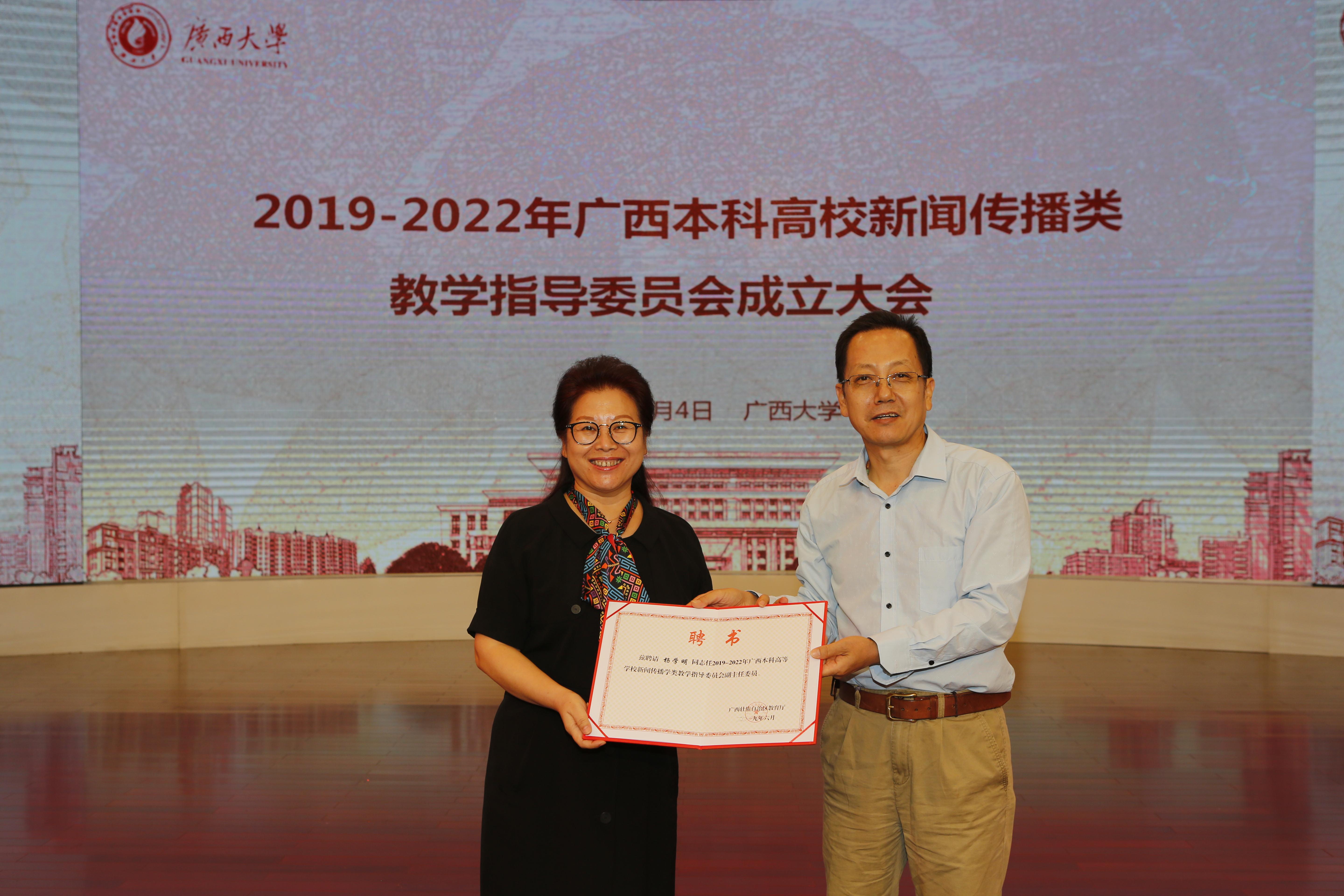 会上,自治区教育厅高教处李国祥副处长、公司教务处黄华存副处长致辞,教育部高等公司新闻传播学类专业教学指导委员会黎明洁委员讲话。广西民族大学教授、教指委副主任杨学明宣布了2019年工作计划。公司常务副经理、教指委主任刘洪向曾建辉等14名委员颁发了2019-2022年广西本科高等公司新闻传播类教学指导委员会委员聘书。会议由南宁师范大学365英国上市集团副经理、教指委副主任周素珍主持。来自区内各高校的新闻传播学学者专家还就团队建设、人才培养、加强与区外教指委联系等问题进行了讨论。