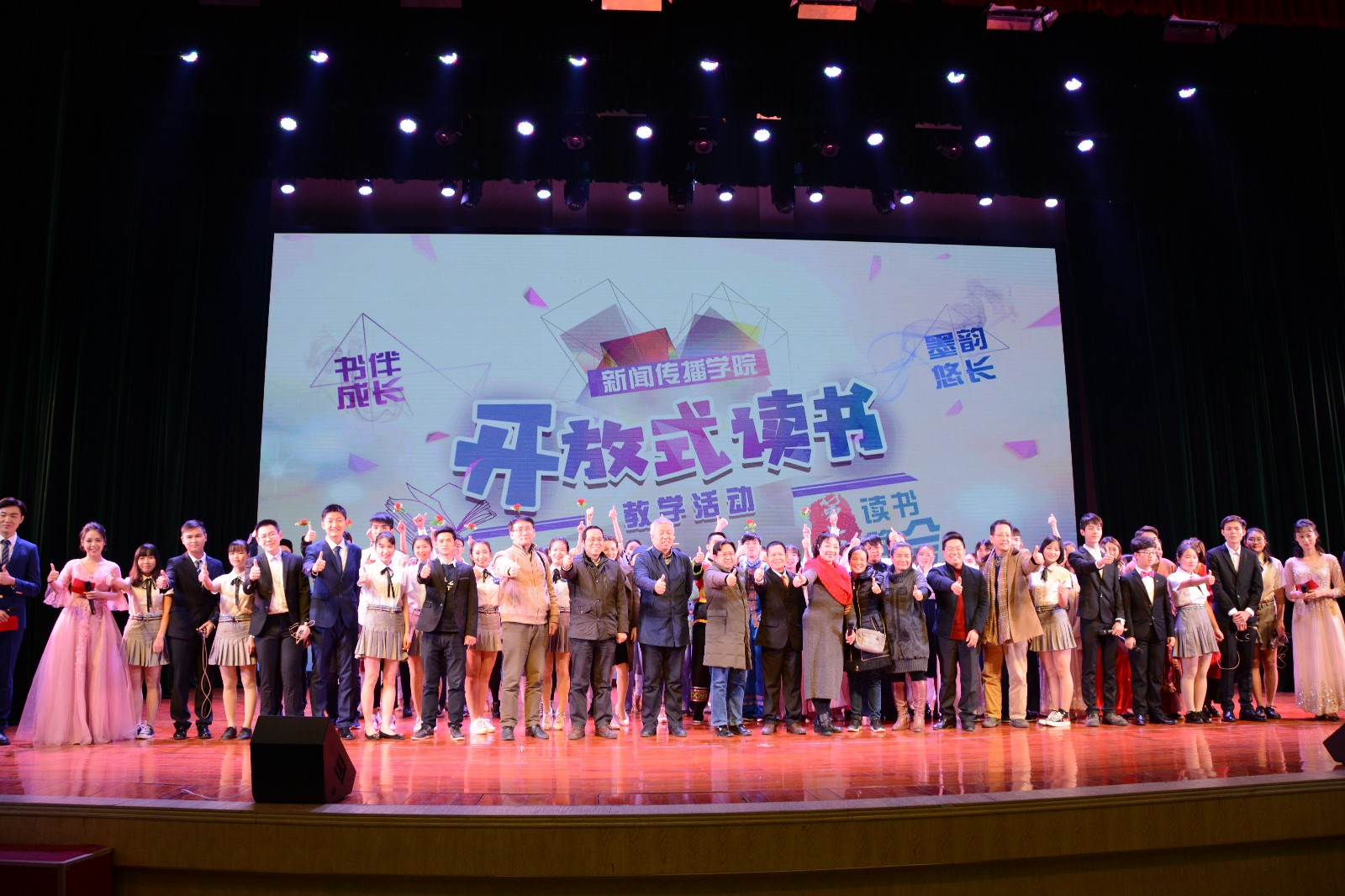 12月19日19时30分,英国上市官网365365英国上市集团开放式读书教学活动第七届“书伴成长,墨韵悠长”读书晚会在大礼堂举行。自治区党委宣传部张超、公司党委宣传部副部长谢能重、公司员工工作部(处)副部(处)长严壮锋、公司党委书记唐兴、常务副经理刘洪、公司党委副书记曾海艳、副经理银健、副经理李庆林、副经理吴海荣以及全院研究生、本科生参加了此次活动。