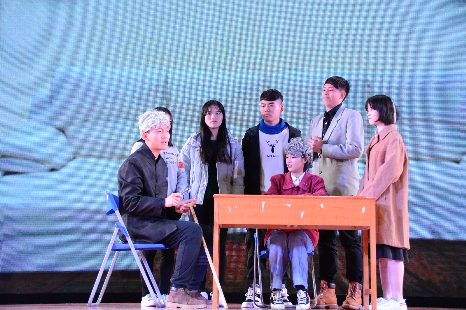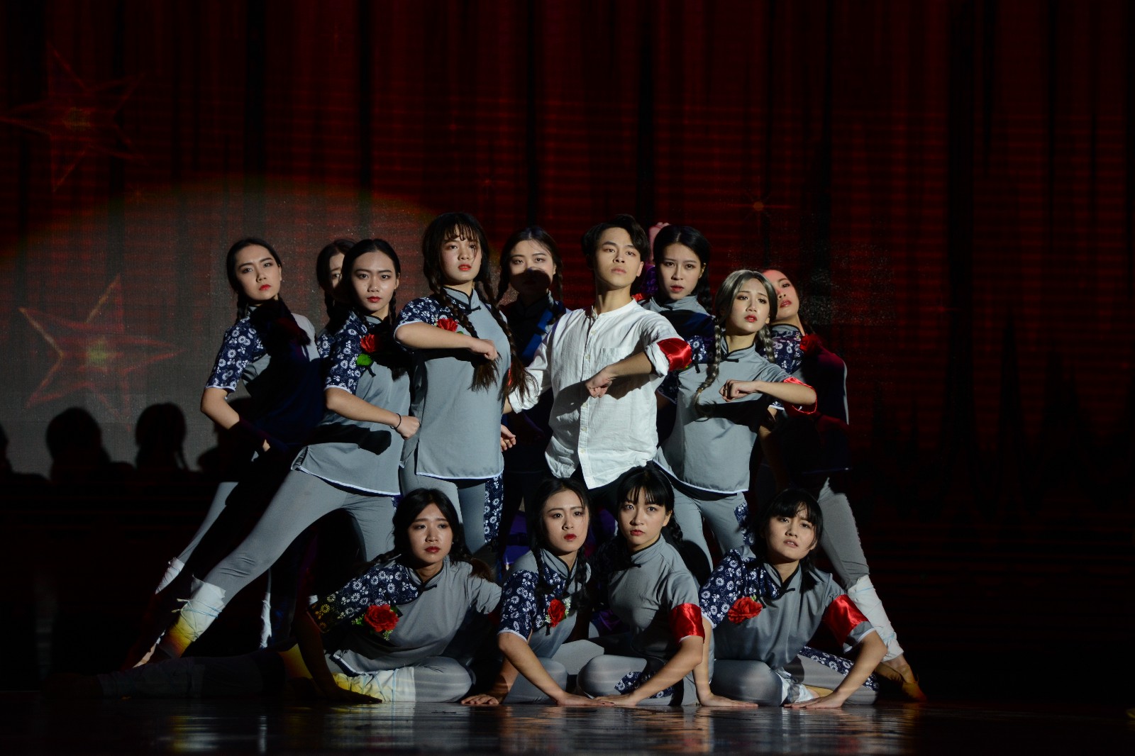 晚会的第三篇章“不忘初心”在研究生会的小品表演《青春中国梦》中开始,研究生们用小品讲述着自己在西大的生活——三五好友相聚,一起讨论自己阅读的书籍。时光正好,我们正青春。接下来,公司舞蹈队为大家带来舞蹈表演《映山红》。红色的背景幕布上闪耀着金色的五角星,台下的同学们看着舞蹈演员的一个个动作,心也随之陷入时而激动、时而悲壮的情感之中。